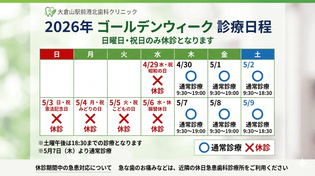 いつも大倉山駅前港北歯科クリニックをご利用いただき、誠にありがとうございます。